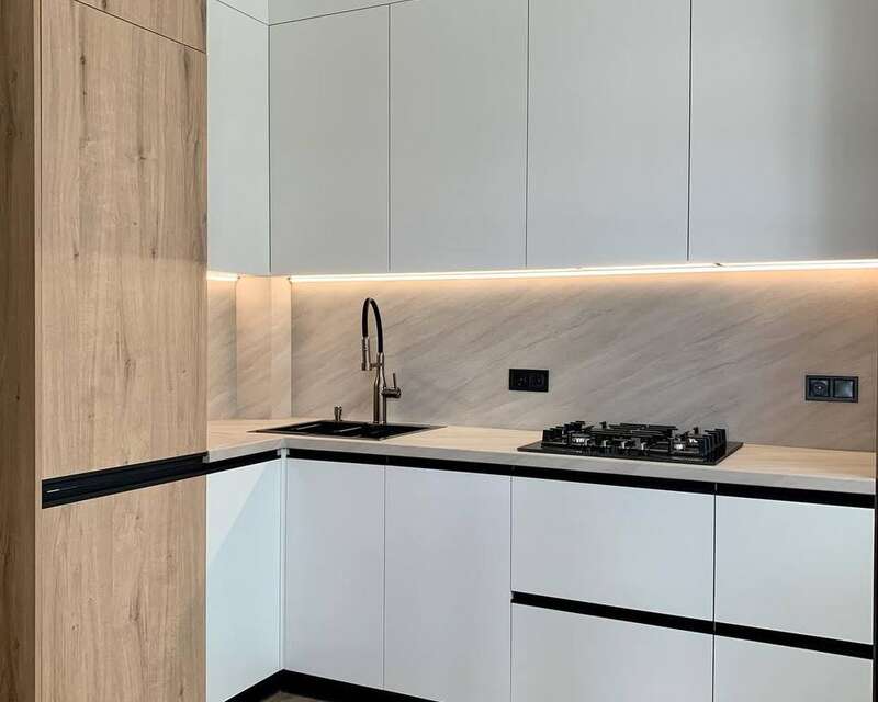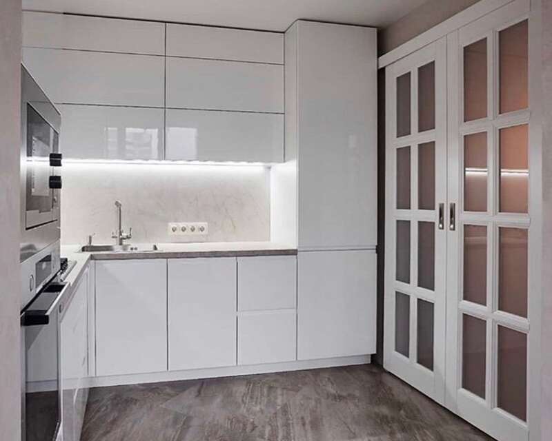 Минимализм и хай-тек: Чёткие геометрические линии, глянцевые или матовые фасады, отсутствие лишних деталей. Фурнитура часто скрытая (push-open). Преобладают монохромные цвета: белый, серый, графитовый, чёрный. Активно используется металл и стекло.