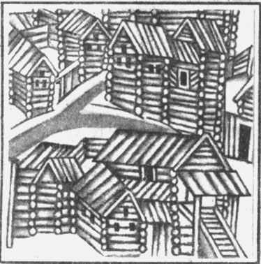 Несколько отступя от: края (30 см), на каждом конце бревна вырубались до половины толщины углубления - "чашки". На два таких параллельных бревна в углубления поперек укладывалась еще пара, в которой также вырубались углубления для следующей поперечной пары. Четыре связанные таким образом бревна составляли венец сруба. Высота сруба зависела от количества венцов (на плане Тихвинского посада избы имеют по 6-7 венцов, т. е. 2,4-2,8 м) (План Тихвинского посада опубликован в кн.: Сербина К. Н. Очерки из социально-экономической истории русского города. Тихвинский посад в XVI-XVIII вв. М. -Л., 1951. Приложение. Если прибегнуть к аналогии, то средняя толщина бревен в крестьянском строительстве XIX-XX вв. составляла 20-25 см. Можно предположить, что до XIX в. при обилии леса на жилье ставили более толстые бревна, до 40 см в диаметре. В таком случае высота шестирядной избы составит 2,4 м, что как будто находит подтверждение в данных о строительстве жилых хором в царском дворце (см.: Забелин И. Домашний быт русских царей в XVI-XVII столетиях, с. 599).). Чтобы бревна лучше прилегали друг к другу, в верхней или нижней части делали паз, а пазы между венцами прокладывали мхом. Такая простейшая рубка срубов называлась рубкой "в обло", и этим способом строили большинство домов как в деревнях, так и в городах. Крестьяне предпочитали простой и надежный способ рубки в обло, но были известны и иные способы ("в крюк" и др.), которые употреблялись при строительстве богатых хором.