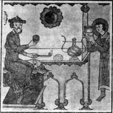 Нацеживание вина из бочки. Миниатюра Синодика XVI в. (ГИМ, отдел рукописей, Щукинское собр., № 143, л. 55).