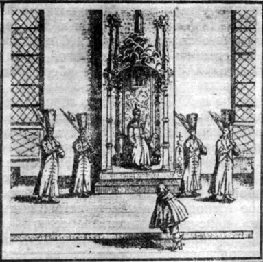 Царский прием голштинского посольства в 1634 г. Гравюра из книги А. Олеария (Олеарий А. Описание путешествия в Московию и через Московию в Персию и обратно, с. 36-37).